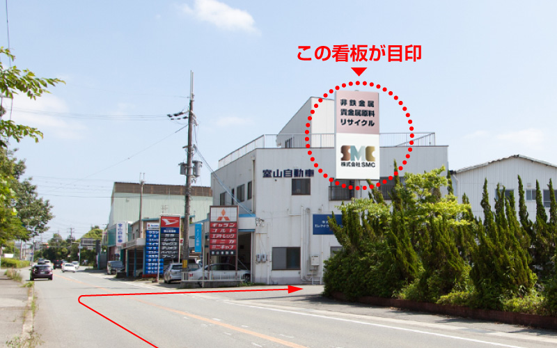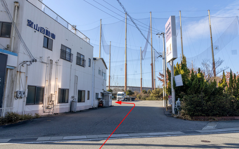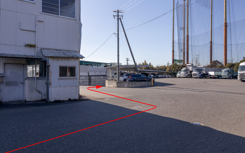当社工場棟前の1〜3番の駐車スペースにお車を停めてください。