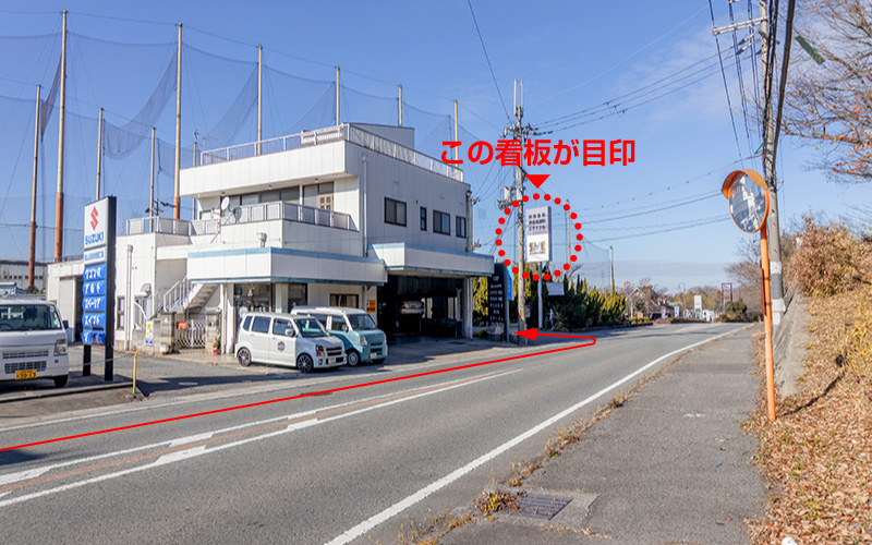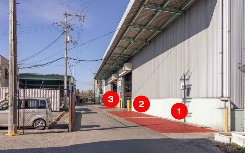 当社工場棟前の1〜3番の駐車スペースにお車を停めてください。
