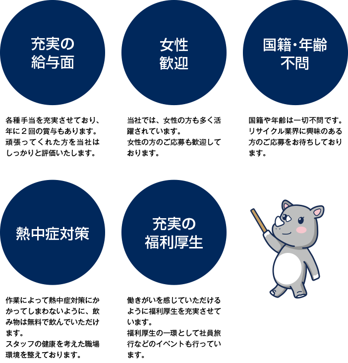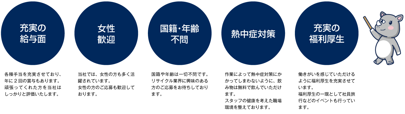 スクラップリサイクル業界は地球環境と明るい未来の為に貢献できる素晴らしい仕事です。また当社工場は効率的かつより良い環境で業務が進められるように、工場内の整理整頓から設備機器の導入にまで非常に力を入れており、とても安全で働きやすい現場です。 貴方のやる気と熱意でリサイクルの現場と流れを学んで頂き、当社と共に成長して頂ける方を募集しております。